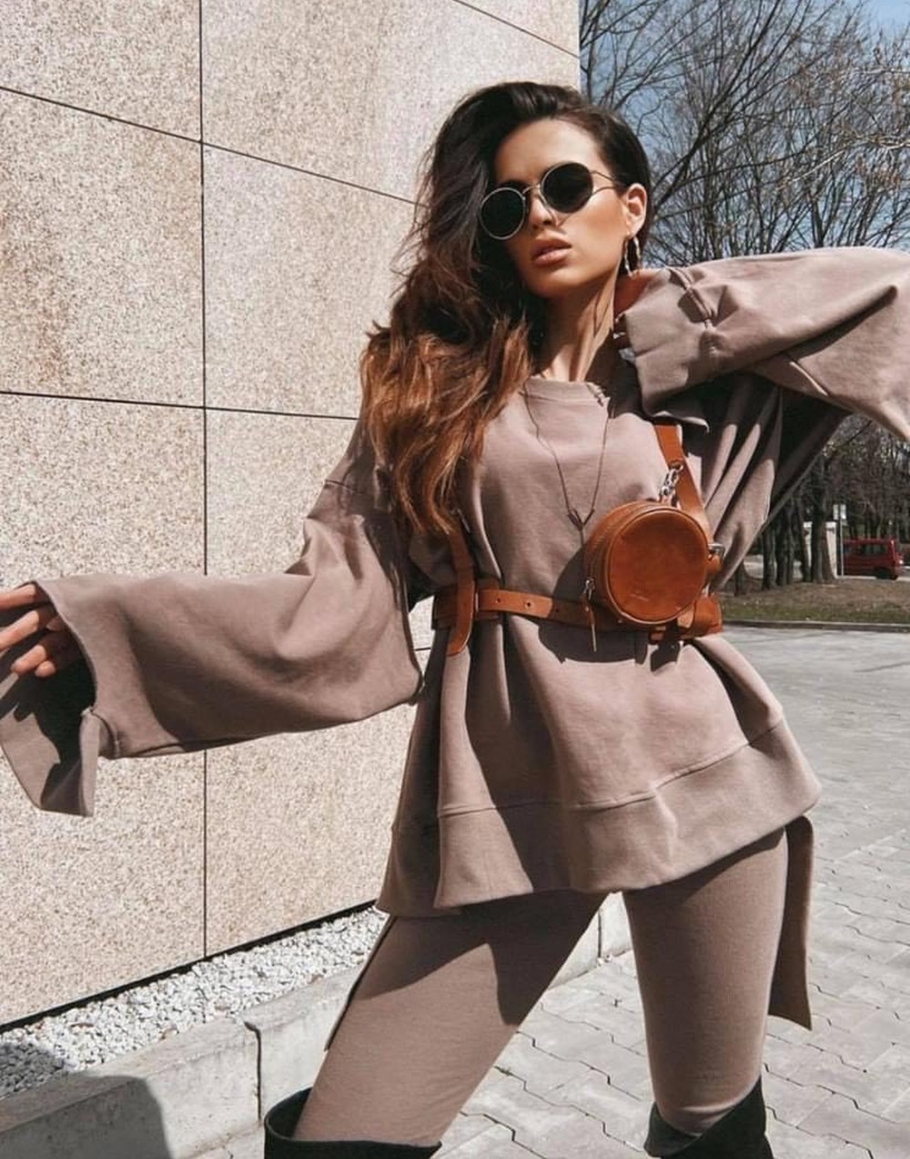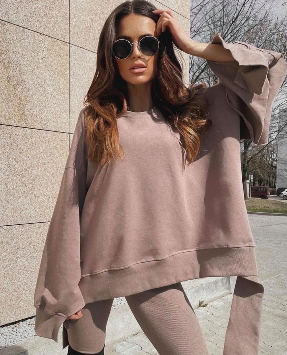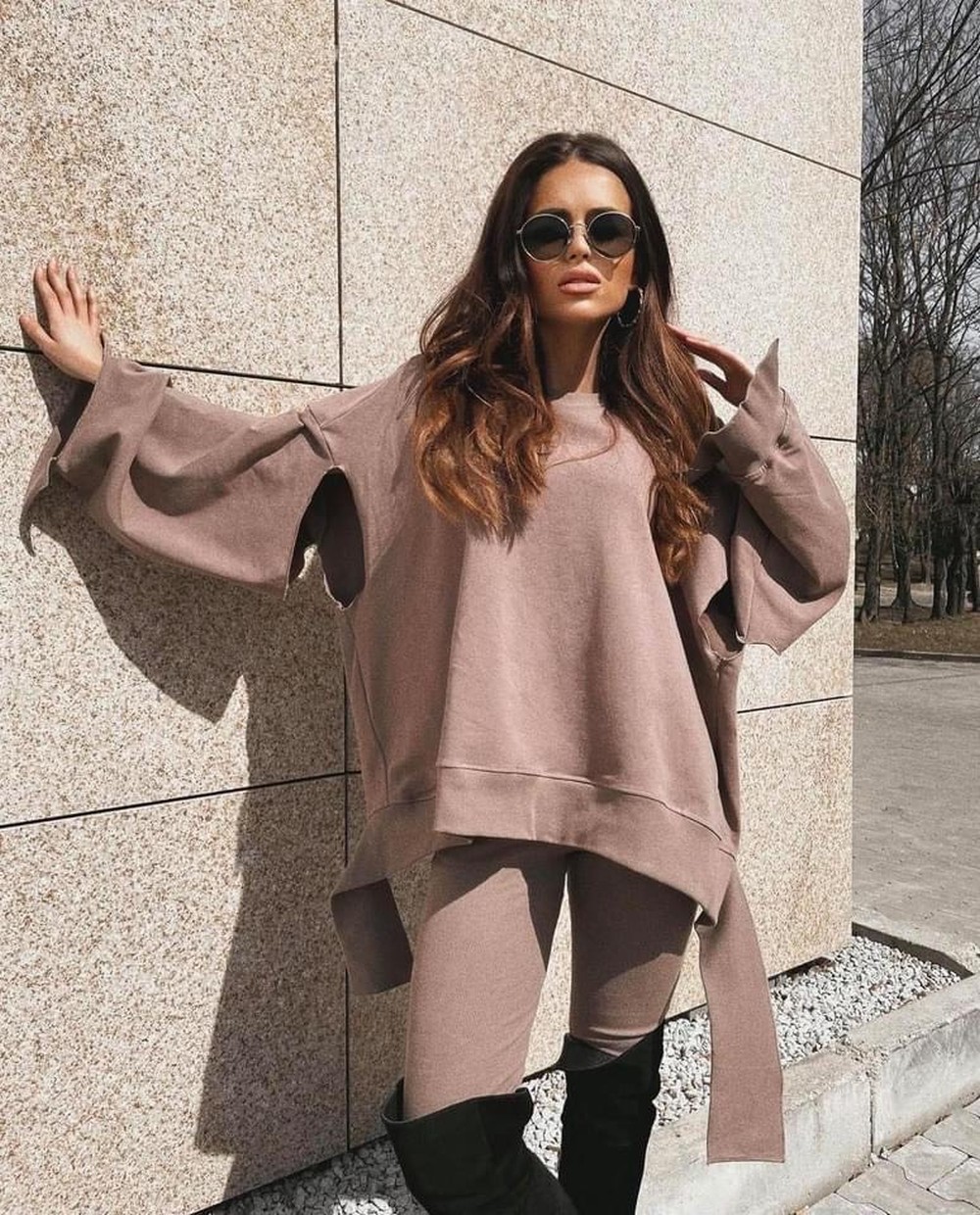 Góra kompletu o nietypowych cięciach idealnie pasuje do prążkowanych leginsów z kompletu.